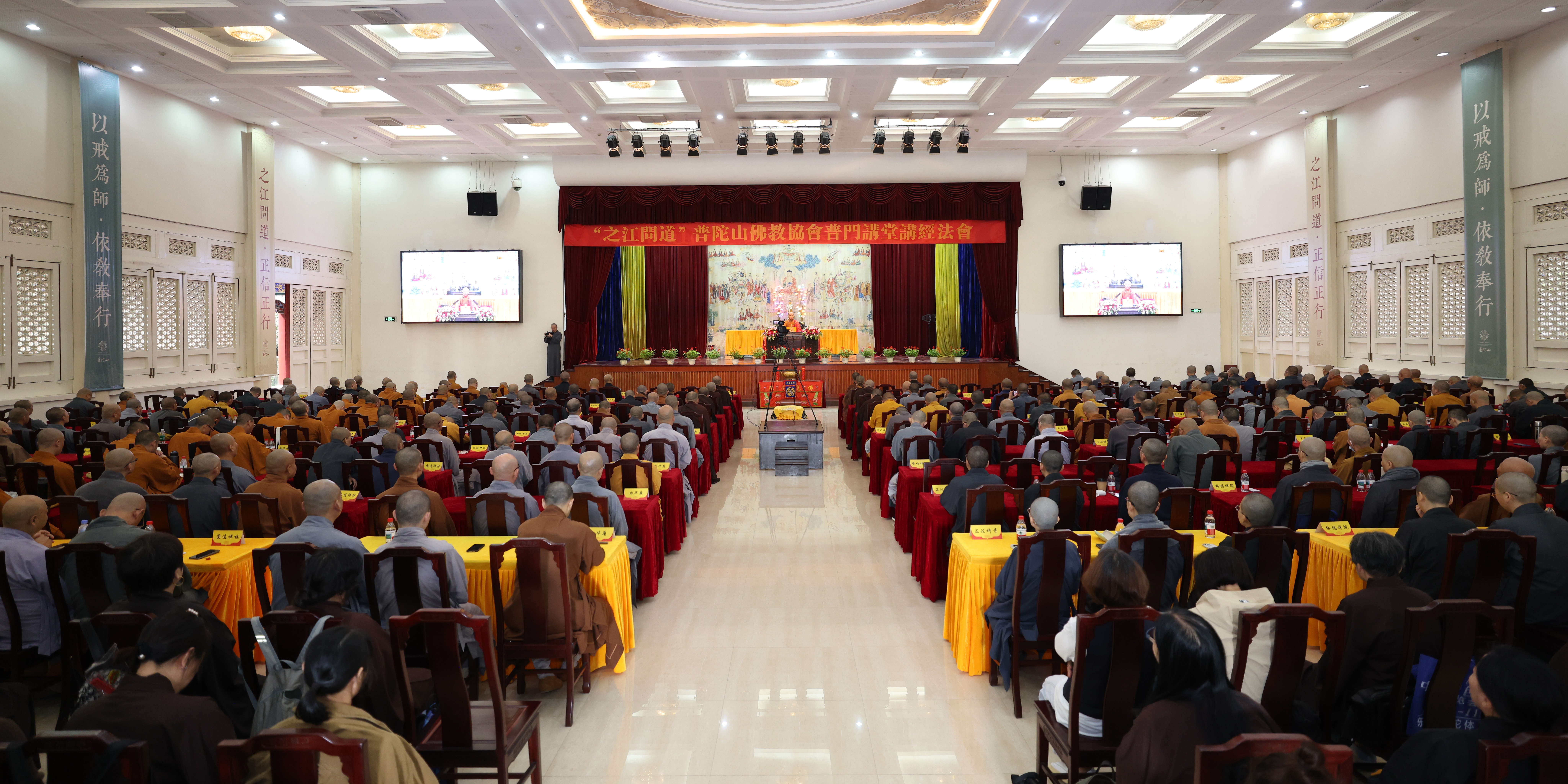 2025年10月26日,“之江问道”普陀山佛教协会普门讲堂讲经法会在普陀山宝陀讲寺举行,普陀山全山各寺院(单位)僧众及随喜护法居士共300余人参加法会。