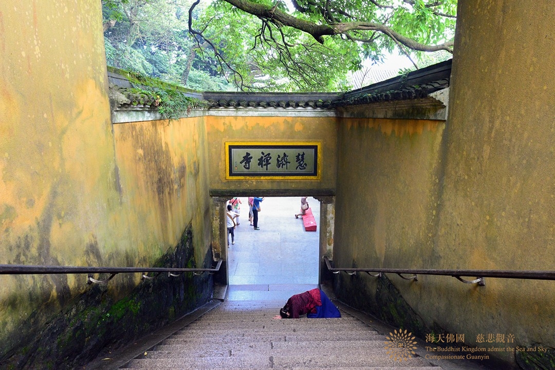 慧济禅寺亦称佛顶山寺,建在佛顶山巅。其处绀殿崇楼,荫映山巅,瑞霭弥漫,祥云呵护,为香客游人向往之名刹,常有“三步一拜上佛顶”之虔诚信众。据历代《山志》载,山巅原有石亭,内供石佛,明万历间(1573-1619),僧圆慧建慧济庵,尚宝司丞沈泰鸿题额“宝月含空”。期间,鄞县薛三台《游普陀山夜宿佛顶山寺》诗云:“为寻绝顶入云深,普向尘寰证佛心。家国艰难余涕泪,乾坤俯仰此登临。上方钟磬圆僧梦,天际波涛送梵音。瀛海扁舟蔬作饭,不须风雨助愁吟!”