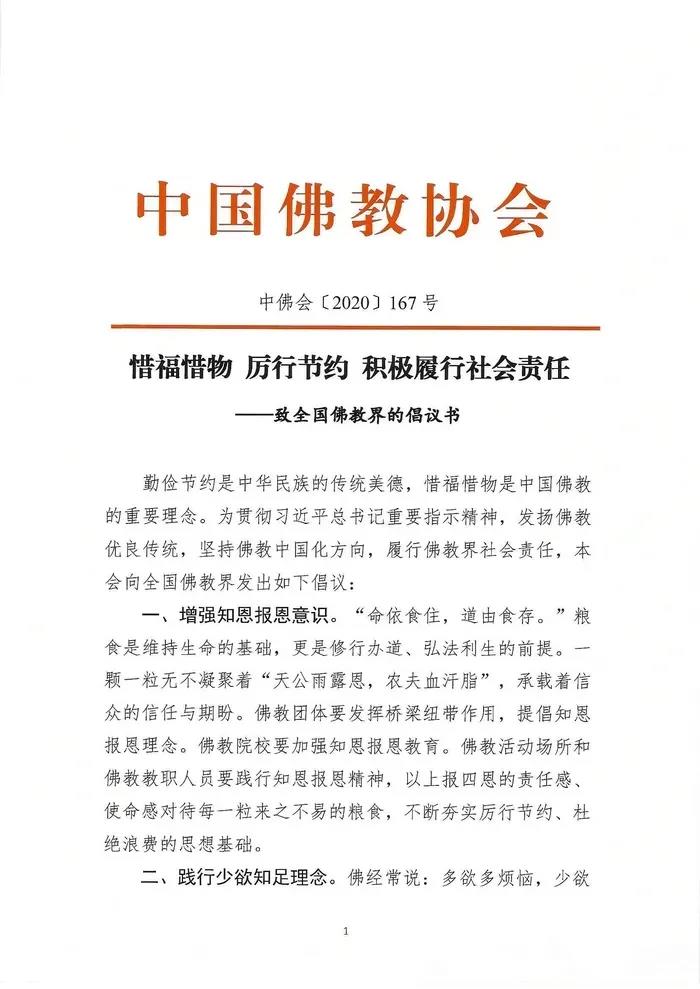 勤俭节约是中华民族的传统美德,惜福惜物是中国佛教的重要理念。为贯彻习近平总书记重要指示精神,发扬佛教优良传统,坚持佛教中国化方向,履行佛教界社会责任,本会向全国佛教界发出如下倡议: