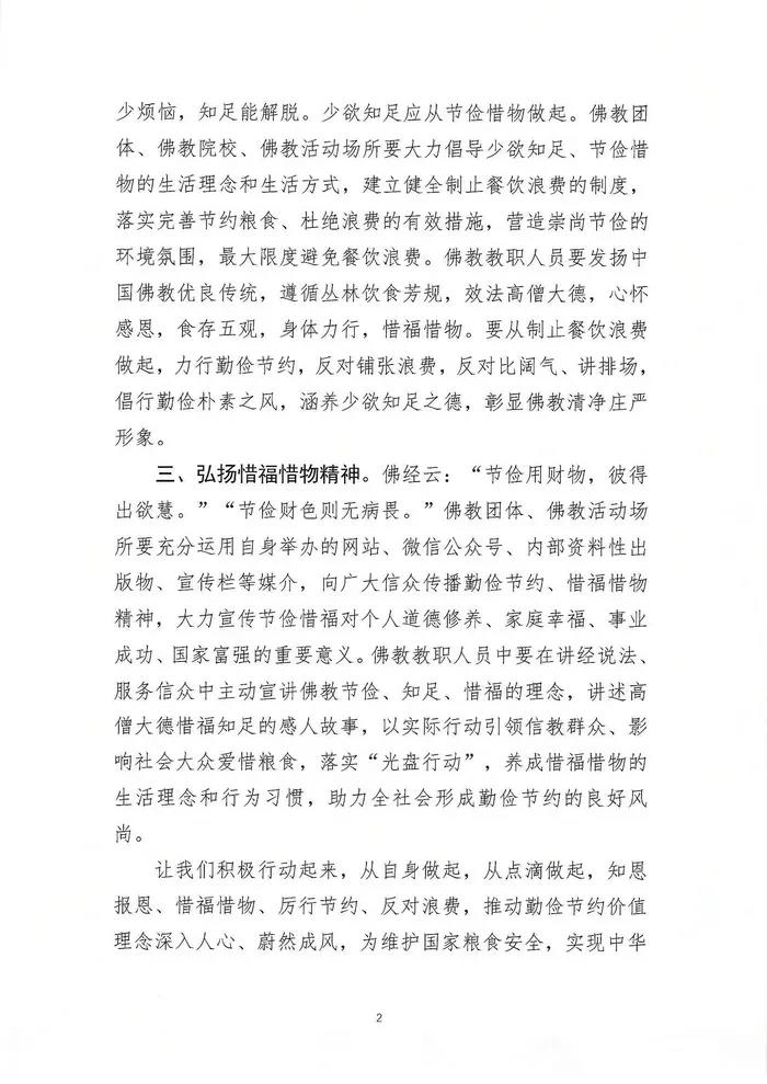 让我们积极行动起来,从自身做起,从点滴做起,知恩报恩、惜福惜物、厉行节约、反对浪费,推动勤俭节约价值理念深入人心、蔚然成风,为维护国家粮食安全,实现中华民族伟大复兴的中国梦贡献佛教界的智慧和力量。