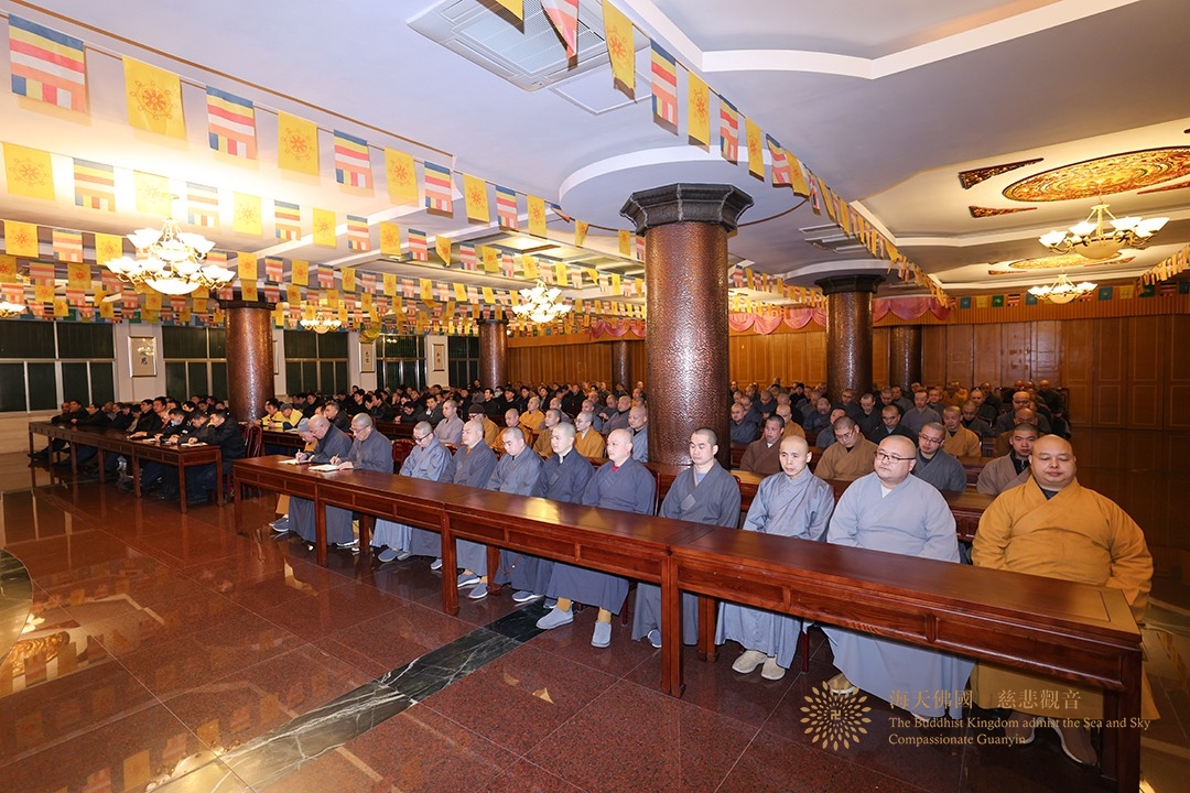 会长道慈大和尚希望大众师父在学修生活中,注意细节,节约惜福,培福养福,做好上殿过堂和佛事法务,坚定信仰,用功办道。待人接物,以柔软语、庆悦语、胜益语,让大家生欢喜心、慈悲心、菩提心,用心用情服务和引导好来山香游客,积极展现菩萨道场的清净庄严形象。