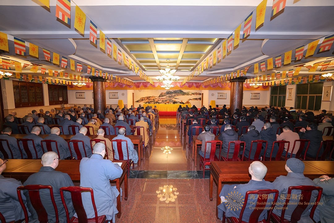 2025年1月22日晚,普陀山普济禅寺召开专题学习会,部署春节期间安全工作。中国佛教协会副会长、普陀山佛教协会会长、中国佛学院普陀山学院院长、观音法界管理中心主任、普济禅寺方丈道慈大和尚,普陀山佛教协会副会长兼秘书长智宗法师,普陀山佛教协会副秘书长、办公室主任昌智法师,普济禅寺监院悟根法师,副监院会达法师、礼证法师出席会议。佛教协会会本部和普济禅寺僧众、职工参加会议。智宗法师主持会议。