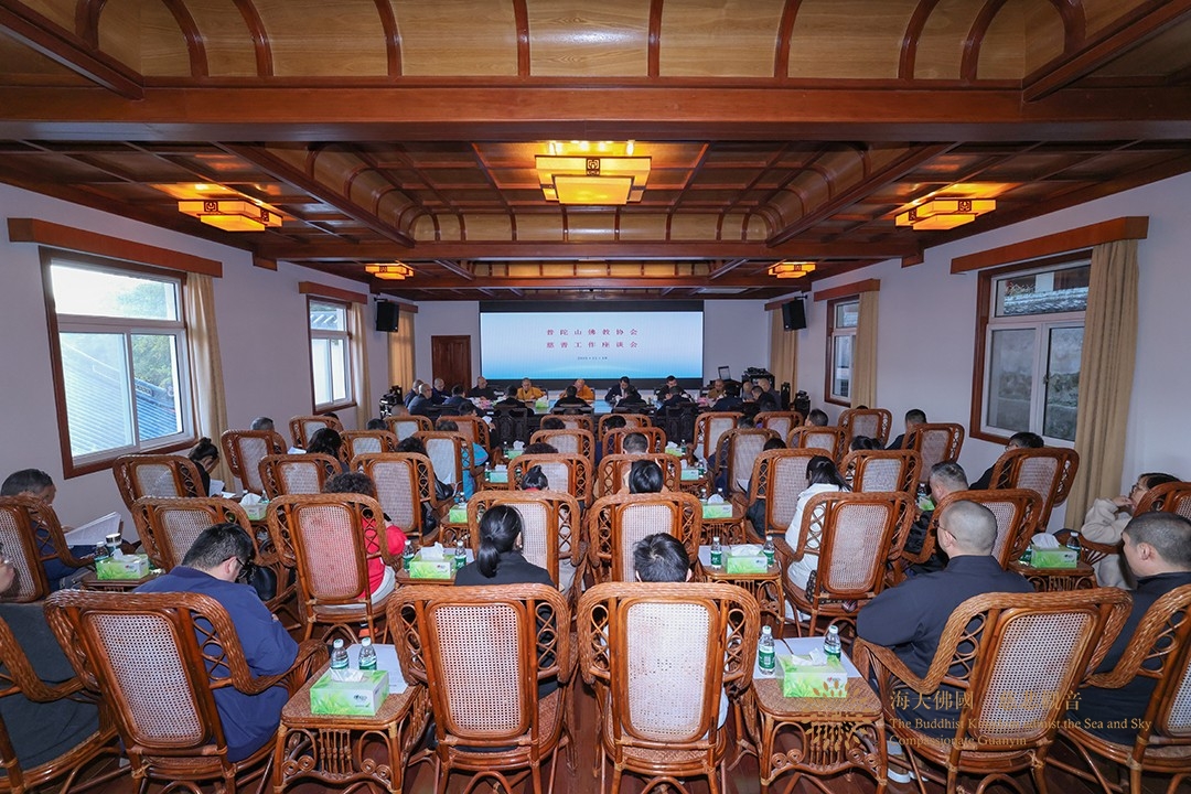 2025年11月19日,普陀山佛教协会召开慈善工作座谈会。市委统战部副部长、市民宗局局长郭纪兵莅会指导,中国佛教协会副会长、普济禅寺方丈道慈大和尚,普陀山佛教协会领导班子成员,市民政局、市慈善总会、市红十字会等单位代表参加会议。
