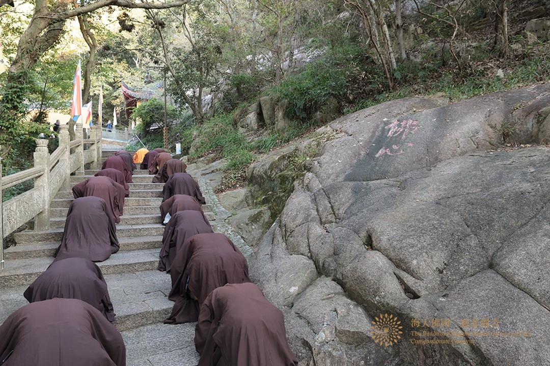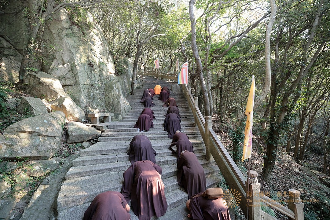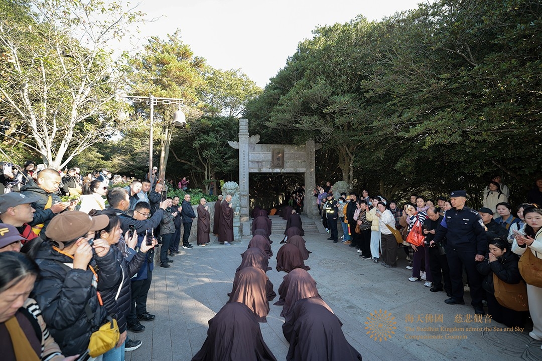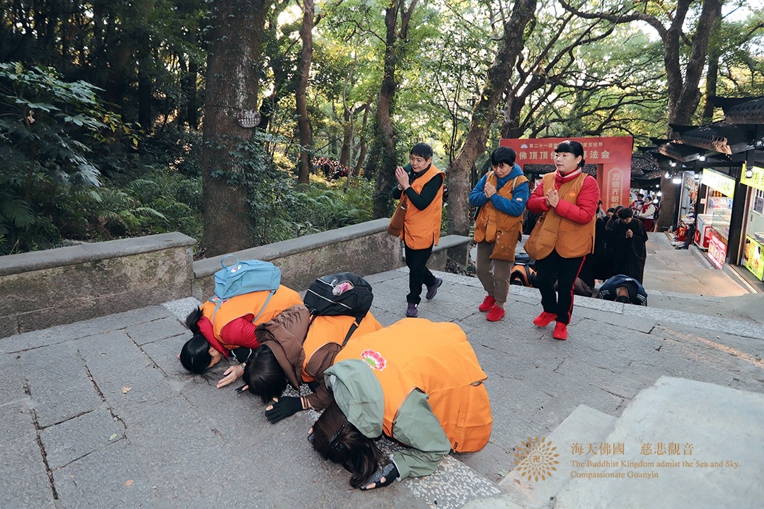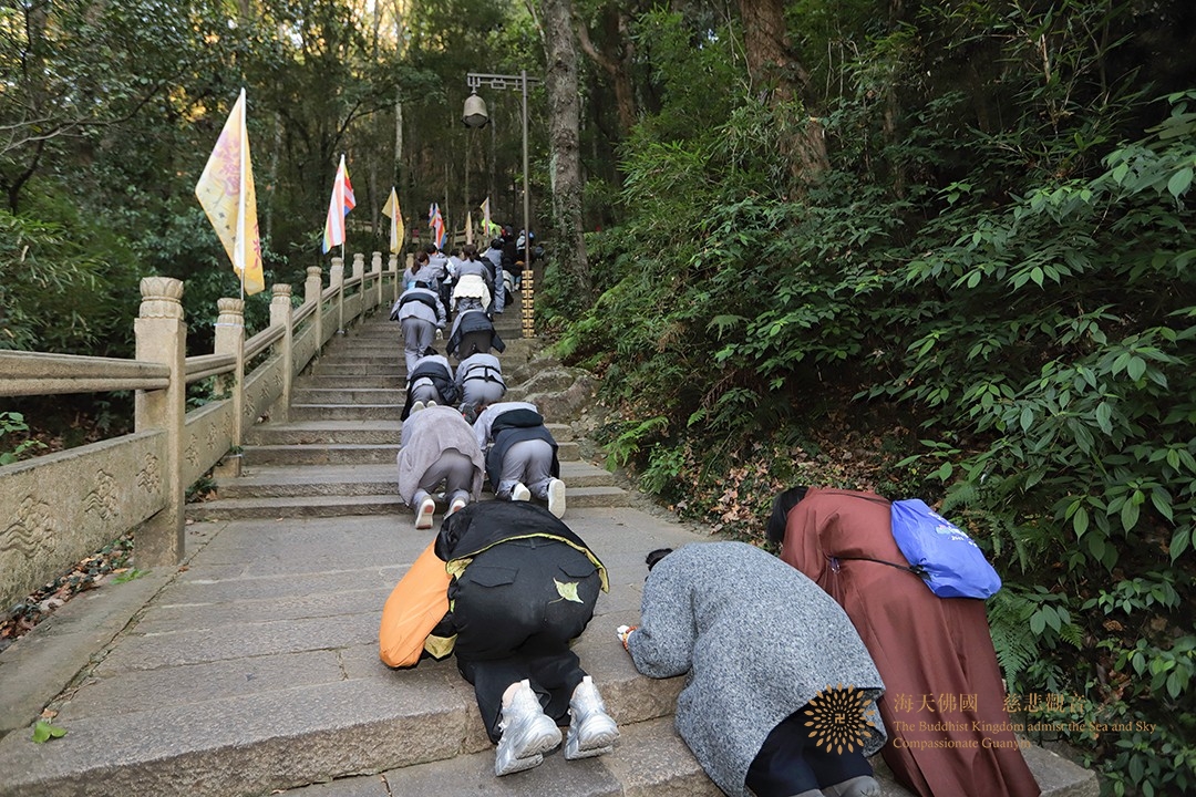 上午7时许,四众弟子由法雨禅寺起香,沿百年香云古道逶迤而上,沿途经过了“海天佛国”“万众共仰”“佛选名山”等摩崖石刻。大家三步一跪拜,口诵“南无观世音菩萨”圣号,声声清越,绵延不绝。朝礼秩序井然、虔诚恭敬,展现了佛弟子正信正行、精进不懈的精神风貌。