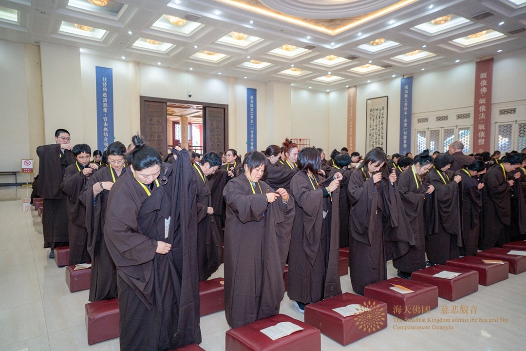 道慈大和尚鸣尺开导,为大众开示求受五戒的目的和意义,广说何为戒,何为五戒,应该如何受持五戒及相应利益功德。大众虔诚礼拜,细心聆听,随后于佛前真诚忏悔往昔所造诸恶业,祈请三宝慈悲摄受。伴随大和尚宣说戒相,传戒正式开始,在“汝尽形寿能持否?”与“能持!”的交替问答中,居士在诸佛菩萨面前立下神圣誓言,齐声应答一时响彻殿宇。在十方三宝的证明和加持下,求戒善信皆欢喜得戒,伴随着“善哉解脱服”的阵阵梵呗声,受戒善信缦衣披身,正式成为满分优婆塞、优婆夷,身心清凉,欢喜无量。