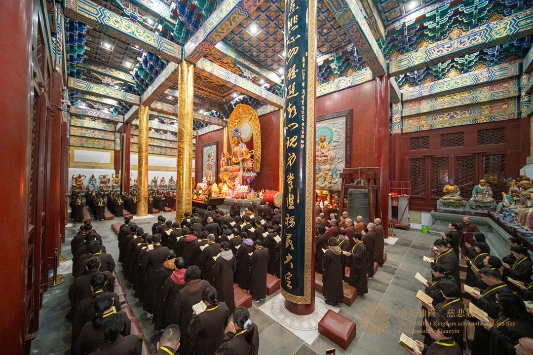 12月17日晚,大众共集圆通宝殿,举行念佛共修。随着维那师起腔,居士们威仪具足,齐称“南无观世音菩萨”,于绵延不绝的圣号之中涵养道念,三业渐趋清净,厚积福德资粮。