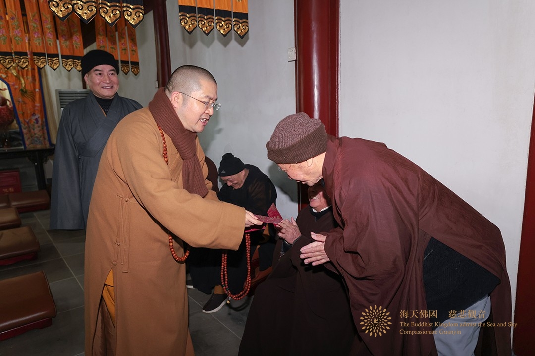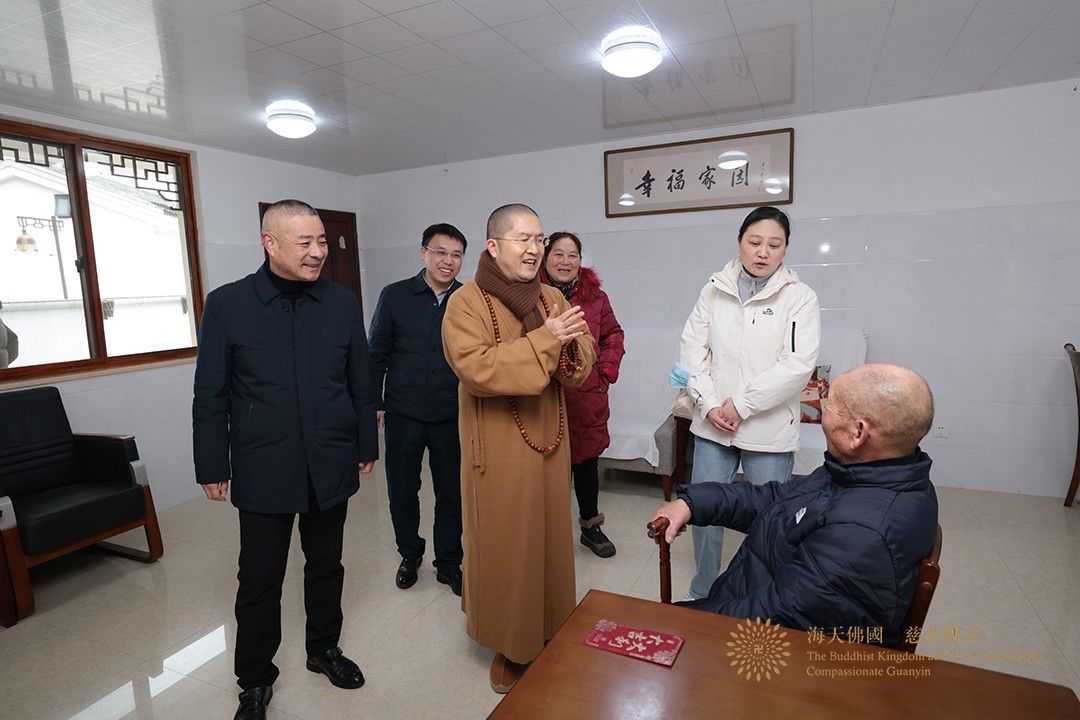2026年1月31日,普陀山佛教协会会长、法雨禅寺监院信光法师一行先后赴佛教颐养堂(杨枝禅林、常乐禅院)和普陀山敬老院进行新春慰问。普陀山佛教协会监事会监事长智宗法师,普陀山佛教协会副会长、南海观音禅林(西方净苑)监院心遐法师,普朱管委会党群工作部副部长陈盈盈等参加慰问。