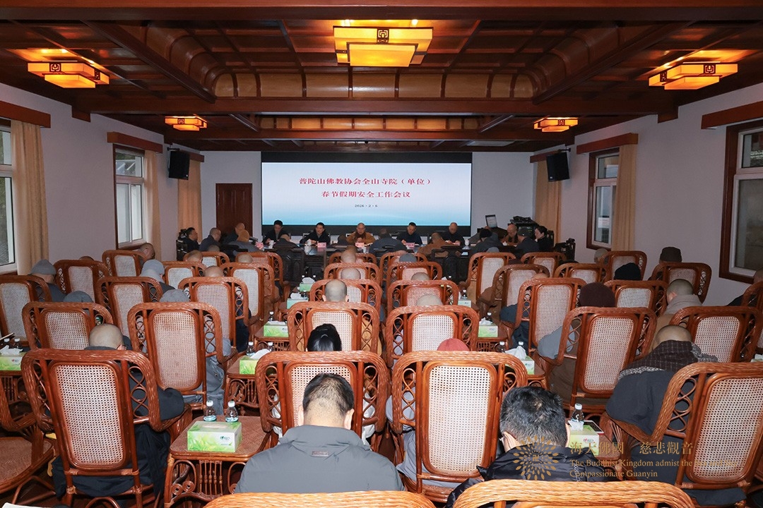 2026年2月6日,普陀山佛教协会在普济禅寺内坛会议室召开全山寺院(单位)春节假期安全工作会议。舟山市委统战部民宗一处负责人莅会指导。普陀山佛教协会理事会、监事会成员,寺院(单位)及佛协职能部门负责人参加会议。会议由普陀山佛教协会会长信光法师主持。