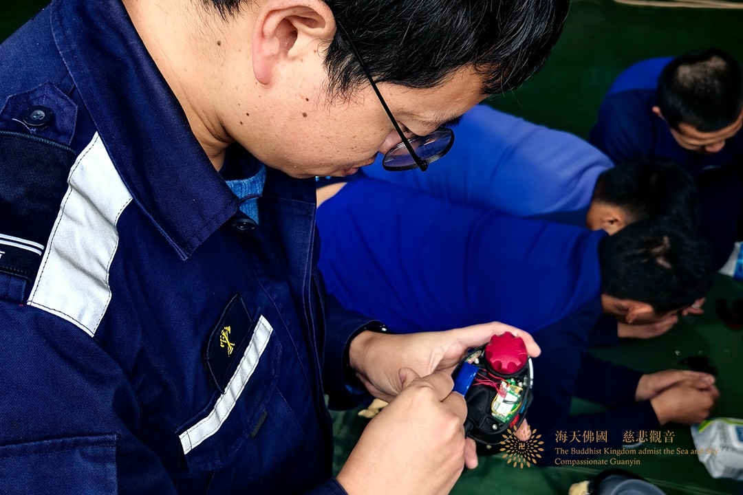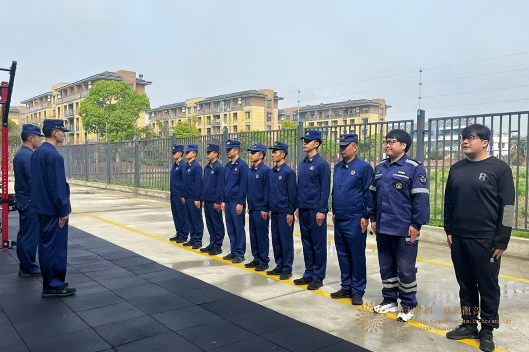 培训期间,普陀山消防大队精心选派4名业务骨干与8名法界队员结成“师徒对子”,针对观音法界建筑体量大、结构复杂、人员密集的特点,“一对一”制定训练计划,手把手现场示范教学。