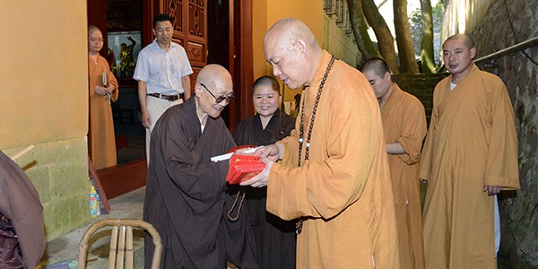 7月31日上午,受佛协会长道慈大和尚委托,佛协副会长沈小扬居士,副秘书长兼办公室主任真常法师,办公室副主任证福法师,以及办公室干事昌其法师、瑞真法师、延廷法师、吉波法师等一行,前往杨枝禅院分别为无碍长老庆祝94岁寿诞、深心长老庆祝91岁寿诞、华愿